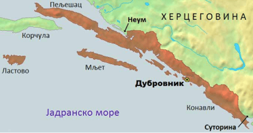Kao što se vidi na prethodnoj karti, najzapadnija stara srpska zemlja je Paganija, koja se prostirala duž jadranske obale, između ušća Cetine i Neretve. Prema Porfirogenetu, Neretljani su imali četiri utvrđena grada: Mokro (Makarska), Verulja (zaliv Vrulja, ali i današnja Gornja Brela), Osrtog (Zaostrog) i Slavinec (Gradac). Pored ostrva Mljet, Korčula, Brač i Hvar, koja su naselili u VIII v., Neretljani su bili organizoavani u tri župe. Rastoca i Mokra su se pružale duž primorja, a Dalena je obuhvatala prostor u unutrašnjosti. Južno od Paganije, nalazilo se Zahumlje, koje je obuhvatalo prostor od Neretve do Dubrovnika. Činili su ga gradovi: Bona (Blagaj), Hum (nejasna ubikacija), Ston na Pelješcu, Mokriskik (možda selo Mokro u Mostarskom blatu), Josli (selo Ošlje), Galumainik (selo Glumine) i Dobriskik (selo Dabar). U ovoj oblasti su se nalazile župe: Ston, Popovo, Žabsko ili Zažablje (oko planine Žabe), Luka (donji tok Neretve), Dubrava (između Stoca i Mostara, dolina Bregave), Dabar (Dabarsko polje), Velika (kraj oko Ljubuškog), Gorimota – Imota (Imotsko polje) i Večenike – Večerić (od ušća Trebižata do Mostarskog blata uz desnu obalu Neretve). Travunija se prostirala od Dubrovnika do Kotora, a imala je utvrđene gradove: Trebinje, Vrm (Klobuk), Risan, Lukavete (izvor Ljute u Konavlima) i Zetlivi (Gradac i selo Zastolje u Konavlima). Prema pomenutom Ljetopisu, ova oblast bila je podijeljena na župe: Trebinje, Ljubomir, Fatnica, Rudine, Kruševice, Vrm, Risan, Dračevica (zaleđe Hereceg Novog), Konavli i Žrnovnica (Župa dubrovačka). Nazivi ovih župa su sačuvani i nije ih teško ubicirati. Duklja se prostirala od Kotora do Drača, a imala je utvrđene gradove: Gradac, Novigrad i Lontodokla (nijedan se ne može sa sigurnošću ubicirati). Župe su bile locirane oko Skadarskog jezera (Luška, Podlužje, Kupelnik, Crmnica, Gorska i Oblik) i u primorju (Prapratna, Kučeva i Grbalj). Ljetopis pominje i Podgorje kao posebnu oblast, unutar koje su se nalazile župe: Onogošt (Nikšić), Morača, Komarnica, Piva, Gacko, Nevesinje, Neretva, Rama, Viševa, Idbar (Prenj) i Kom (Glavatičevo). Ove župe su kasnije pripadale Zeti, Raškoj, Bosni i Humskoj zemlji.