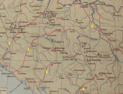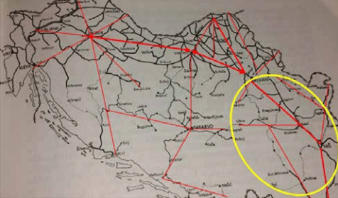 Karta 2.28. Mreža saobraćajnih koridora i glavnih centara unutar saobraćajnog sistema SFRJ i glavnog koridora od Jesenica do Đevđelije. To je bio naš „jedan pojas, jedan put”.
