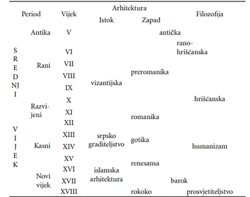 Period Vijek Arhitektura Filozofija Istok Zapad Antika V antička Rani VI vizantijska preromanika ranohrišćanska VII hrišćanska VIII IX Razvijeni X XI romanika XII Kasni XIII srpsko graditeljstvo gotika XIV humanizam XV islamska arhitektura renesansa Novi vijek XVI XVII barok XVIII rokoko prosvjetiteljstvo Na tlu BiH otkriveni su spomenici iz perioda kasne antike (do 476 g.) i ranohrišćanskog perioda (200–500/700 g.), koji, uglavnom, pripadaju vizantijskoj umjetnosti. Najveći broj su crkve iz V–VI v., koje se nalaze na više lokaliteta. U centralnoj Bosni najveći broj je otkriven u okolini Travnika (Turbe, Veliki i Mali Mošunj, Oborci), Kreševa (na brdu Gradac), Vareša (selo Dabravine), te kod Zenice i Breze. U zapadnoj Bosni pronađeni su ostaci crkava u Duvnu (lokalitet rimskog Delminijuma), Bihaću (selo Založje), Kotor Varoši (selo Šiprage), Mrkonjić Gradu (selo Majdan), a u istočnom dijelu, najznačajniji lokalitet su Skelani. Na tlu Hercegovine, najznačajniji ostaci crkava pronađeni su u okolini Stoca (selo Vidoštak i Blagaj), Vitine (selo Borasi), Čapljine (Mogorjelo i selo Tasovčići) i Mostara (selo Potoci). Od sličnih spomenika iz istog perioda, najveći značaj na tlu današnje Srbije imaju Caričin Grad ili Justiniana Prima (Lebane) i Ulpiana (između Gračanice, Prištine i Lipljana). U slivu Morače i Zete i oko Skadarskog jezera, nalazila se Duklja (Dioclia), koja se od XI vijeka zove Zeta. Središte je bilo Doklea (kod Podgorice), u kojoj se nalazilo više bazilika, a tu je pronađena i staklena čaša.