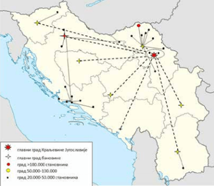 Na prethodnom kartodijagramu uočljiva je različita prostorna distribucija gustine stanovanja koja presudno diktira i karakter funkcijskih odnosa unutar države. Iz ustavnog uređenja, proizašao je i opšti okvir nodalno-funkcijskih odnosa. Pošto su se odnosi između republika sve više konfederalizovali, a unutar Srbije veze sa autonomnim pokrajinama federalizovale, jačao je birokratsko-upravljački aparat u njihovim glavnim gradovima. Kao paralelan proces, išla je institucionalna izgradnja glavnih gradova u svim domenima, od institucija obrazovanja i zdravstvene zaštite do naučnih, kulturnih i sportskih sadržaja. Ovo je značajno ojačalo gravitacionu snagu i funkcijske veze ovih centara sa centrima nižeg hijerarhijskog nivoa, što je dovelo do brzog rasta broja stanovnika ovih nodusa. Prostori najveće koncentracije stanovništva (>40 st./km2 ) podudaraju se sa produžetkom Panonske osovine na Moravsko-vardarsku udolinu (Slovenija, Hrvatska, Vojvodina, Srbija, Makedonija), dok su najrjeđe naseljeni centralni brdsko-planinski prostori BiH, Crne Gore i Kosova i Metohije (Za pojavu neadekvatne urbanizacije karakteristične su i ostale subpojave, posebno neadekvatna infrastrukturna izgrađenost, koju u početnoj fazi karakteriše veća stopa imigracije i manja mogućnost zapošljavanja.