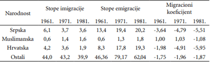U periodu 1948–1981. god. iz BiH se iselilo 548.417 lica, a uselilo 158.291 lice. Procenat neto migracionog salda od ukupnog stanovništva je različit po pojedinim periodima. Najmanji je bio u intervalu 1948–1952, kada je od prosječnog broja stanovnika iznosio 1,1%, a najveći 6,1% u periodu 1961–1970. Međutim, procenat neto migracionog salda u odnosu na prirodni priraštaj je daleko veći i u devetoj deceniji prelazi 25%. Prema tome, emigracije iz BiH bile su vrlo značajne (Pašalić, 2017).