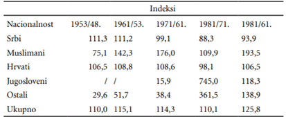Srbi su bili relativna većina u ukupnom stanovništvu od 1953. (44,3%) do 1971. (37,1%), a 1991. su spali na 31,2%. Muslimani (naknadno Bošnjaci) imali su kontinuiran rast i porast učešća u ukupnom stanovništvu sa 31,2% (1953) na 39,5% (1971) i 43,4% (1991), dok su Hrvati bilježili lagani pad sa 22,9% (1953) na 20,6% (1971) i 17,3% (1991). Samo iz ovih primjera moguće je prepoznati glavne tendencije demografskog razvoja u etničkom i regionalnom kontekstu. Muslimani su bilježili visoke stope rađanja i bili su etnička grupa sa najmlađim stanovništvom. Srbi i Hrvati su bilježili kontinuiran pad relativnog učešća u ukupnom stanovništvu, a pored nižih stopa rađanja i viših stopa umiranja, ove etničke grupe bile su veoma brojne u međurepubličkim migracijama. Srbi iz BiH su tradicionalno emigrirali u Srbiju, Hrvati u Hrvatsku, a Muslimani iz Raške oblasti su rado dolazili u BiH. Ovako dinamičan rast stanovništva BiH uslovio je promjene i u etničkoj strukturi. Prema Pašaliću (2012), učešće srpskog, hrvatskog i muslimanskog stanovništva u ukupnoj populaciji BiH povećano je u periodu od 1961. do 1991. godine sa 90,3% na 92,1%, uz bitno drugačije odlike populacione dinamike tih etničkih grupa. Takođe, u periodu od 1961. do 1991. godine u BiH je uočen i znatan broj lica koja su se izjašnjavala kao Jugosloveni. Njih je 1961. godine bilo 275.883 (8,4%), 1981. godine 326.280 (7,9%), a 1991. godine 239.777 (5,5% ukupnog stanovništva).