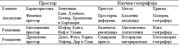 Табела 0.2: Концептуализација простора и развој научне географије