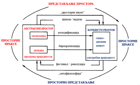 Слично је било и са релацијом између појмова простор и мјесто у 1970-им или, у мањем степену, као простор и природна средина у 1970-им и 1980-им. На крају, Лефевр [Lefebvre] (1969) уводи појам „производња простора“ (Production of Space), а Харви [Harvey] (1973) уводи социјалну праксу у географска истраживања, па умјесто питања „Шта је простор?“, поставља се питање „Како то да различите људске праксе стварају и користе карактеристичне концептуализације простора“? Ово је у географију увело релацијски концепт у којем је простор „пресавијен“ (folded into) у друштвене односе кроз практичне активности. То је дозвољено не само за „социјализацију просторне анализе“, већ и пресудно за „спацијализацију друштвене анализе“, чиме смо закорачили у свијет постмодерних географија. Термин животна средина указује на интеракцију човјека са природном и друштвеном средином и исказује појмовну блискост са терминима пејзаж и природна средина, при чему се на овим питањима огледа прожимање географског и филозофског. Пошто поменуте еколошке цјелине карактерише ↑уникатност и непоновљивост, оне су посебне и различите, али не треба романтизовати њихову локалност. Ове разлике могу бити занимљиве и животне, али и опасне. Из тога произлази и један од задатака географије, да треба омогућити људима да разумију те сличности и разлике и да на њих гледају са уважавањем, а не на деструктивни начин. Да ли смо ово разумјели кроз историјске и геополитичке поруке ↑постмодерне? Комплексност ових појмова најбоље илуструје овај Лефевров дијаграм: