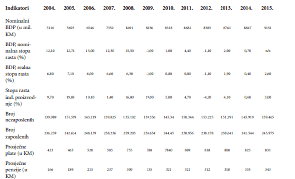 Iz prethodne tabele vidljiv je ogroman ekonomski rast u periodu 2004–2015. koji je karakterisao rast nominalnog BDP-a (bez uključenog iznosa inflacije) za 4,035 milijardi KM (78,8%). Posmatrajući prosječni apsolutni godišnji rast, to je bilo uvećanje za 366,8 miliona KM ili prosječno 5,1%. Ipak, unutar ovog vremenskog okvira jasno se uočava postojanje dva različita perioda. Prvi je karakteri Ekonomski rast predstavlja povećanje kapaciteta privrede da proizvodi dobra i usluge i mjeri se obimom BDP-a. Uglavnom se vezuje za tehnološke promjene, ali to nije samo čisto povećanje kapaciteta proizvodnje već i unapređenje uslova života ljudi koji žive od te privrede. 211 stičan za period do izbijanja ekonomske krize 2008, koji karakterišu impozanatni makroekonomski pokazatelji. Apsolutni rast BDP-a iznosio je 3,375 milijardi KM (65,9%) ili prosječni godišnji apsolutni rast 675 miliona KM. Posmatrano u relativnim pokazateljima, to je bio prosječni rast tokom pet godina od 9,9%. Drugi period, tokom narednih šest godina, karakteriše kratkotrajna recesija (negativan rast BDP-a) i veoma usporen ekonomski rast. Ostvaren je skroman rast BDP-a od svega 915 mil. KM (11,1%), što je predstavljalo prosječno godišnje povećanje za 152 mil. KM ili stopu rasta tek od 1,7%. Prosječni godišnji apsolutni rast BDP-a iznosio je 366,8 mil. KM, dok je stopa relativnog rasta BDP-a iznosila 5,14%.