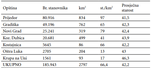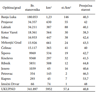 Starosna struktura stanovništva pokazuje da najstarije stanovništvo živi upravo u ovom tipu naselja. U sferi srednje velikih naselja (1000–5000) situacija je obrnuta. Ova regija ima u prosjeku 4,5 puta manji broj ovih naselja (5,8%) u odnosu na Bijeljinu (27,4%) i Doboj (26,8%), dok u domenu najvećih urbanih centara (> 5000) ovi odnosi (Hercegovina 32%, Potkozarje 12%) ukazuju na broj opština u regiji, što proporcionalno odgovara ovim odnosima. Kvalitetnije pokazatelje o suštinskim regionalnim razlikama u domenu urbano-ruralnih odnosa između 2756 naselja donosi naredna tabela: