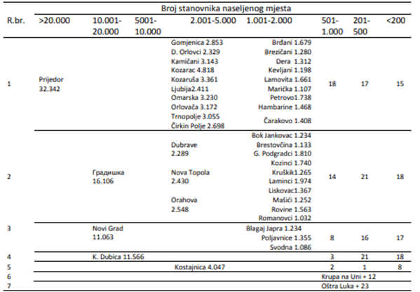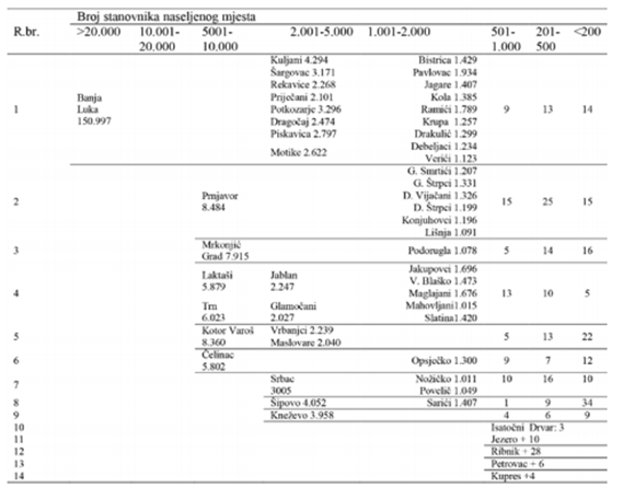 Tabela 4.9. Urbani odnosi u mezoregiji Potkozarje na osnovu preliminarnih podataka o broju stanovnika Republike Srpske prema naseljenim mjestima.