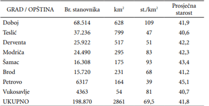 Najmanje tri opštine su podijeljene, jer su dijelovi nekadašnjih opština Gradačac, Orašje i Gračanica. Prosječna starost stanovništva je 41,89 godina, tik iznad republičkog prosjeka (41,39), pri čemu nema tako velikih oscilacija u vrijednostima između opština (najmlađe stanovništvo ima Teslić, a najstarije živi u Petrovu). Proticaj u maju 2014. iznosio je 4121 m3 /s ili 40 puta više od prosječnog. Ove poplave su izazvale najveću štetu u Doboju, Šamcu i Bijeljini, a ukupan iznos štete bio je 1 milijarda € ili približno koliko i budžet Republike Srpske za 2015.