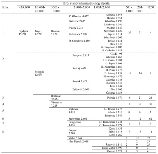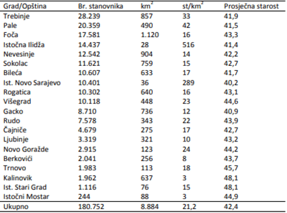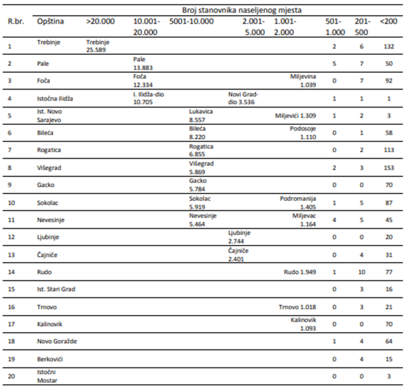 Ova tabela ukazuje i na odsustvo naselja srednje veličine. Uglavnom pored opštinskog centra postoje samo najmanja naselja, a to znači da je snažno izražen proces depopulacije opštine i da su u malim seoskim naseljima ostala samo stara lica. To potvrđuje odnos broja stanovnika opštinskog centra i ukupnog stanovništva opštine. Najlošija situacija je u Trebinju, gdje je u centru koncentrisano 87,6% ukupnog stanovništva, u Istočnom Novom Sarajevu je to 80,4%, a u Bileći 76%. Nešto povoljnija situacija je u Istočnoj Ilidži, 72,5%,122 Foči 67,4%, Palama 66,3%, Gacku 64,3% i Rogatici 63,9%. Najpovoljniji prostorni raspored stanovništva na teritoriji cijele opštine imaju Nevesinje – 42,1%, Sokolac – 49,2% i Višegrad – 55%.