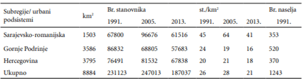 Iz prethodne tabele vidljivo je da cijeli prostor ove mezoregije predstavlja 37,8% ukupne površine Republike Srpske, na kojem u 1243 naselja živi tek 16,6% njenog stanovništva. Gustina stanovanja predstavlja tek 43,8% prosječne vrijednosti za Republiku Srpsku. Kada je u pitanju veličina pojedinih urbanih sistema koji egzistiraju unutar ovih subregionalnih cjelina, postoje razlike i one su dodatno pojačane odsustvom kvalitetnih infrastrukturnih veza među njima. U domenu hijerahije urbanih centara (vertikalna dimenzija), na osnovu koje se vidi koliki broj malih centara funkcionalno zavisi od centra višeg ranga, mogu se prepoznati četiri nivoa. Prvi nivo su subregionalni centri koji svojom veličinom i gravitacionom snagom predstavljaju osnovu za buduću diferencijaciju jednog mezoregionalnog centra, a u ovu grupu spadaju: Trebinje, Foča i dvojni centar Pale i urbana središta Istočno Novo Sarajevo/ Istočna Ilidža.